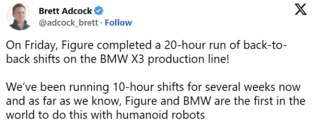 현재 자동차 생산 과정에서 앞선 성과를 내고 있는 로봇은 피규어 02입니다. 브렛 애드콕 피규어AI 최고경영자(CEO)는 지난달 21일(현지 시간) 엑스 계정을 통해 피규어AI의 휴머노이드 로봇이 BMW의 미국 사우스캐롤라이나주 공장 내 X3 생산 라인에서 20시간 연속 근무에 성공했다고 발표했습니다. 그는 “피규어가 BMW X3 생산라인에서 20시간 연속 근무를 완료했습니다. 이미 몇 주 동안 10시간 교대 근무를 진행해 왔으며 저희가 아는 한 피규어와 BMW가 휴머노이드 로봇으로 이 같은 성과를 세계 최초로 달성했습니다”고 밝혔습니다.