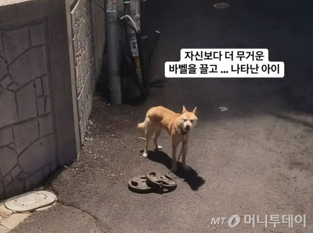 유기견 보호소 및 반려견 입양 카페를 운영하는 '너와함개냥' 대표 A씨는 지난 2일 어두운 저녁 한 골목길에 찍힌 개 사진을 올렸다. 개는 목줄 끝에 운동 기구인 바벨 플레이트 2개를 매달고 있었다. 무게는 30㎏에 달했다.