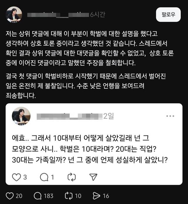 논란이 커지자 이 시의원은 "상위 댓글에 학벌에 대해 설명하고 상호 토론 중이라고 생각했던 것 같다"며 "확인 결과 상위 댓글에 대한 대댓글을 확인할 수 없었고 상호 토론 중에 이어진 (비하 발언을 한) 댓글이라고 말한 주장을 철회한다"고 설명했다.