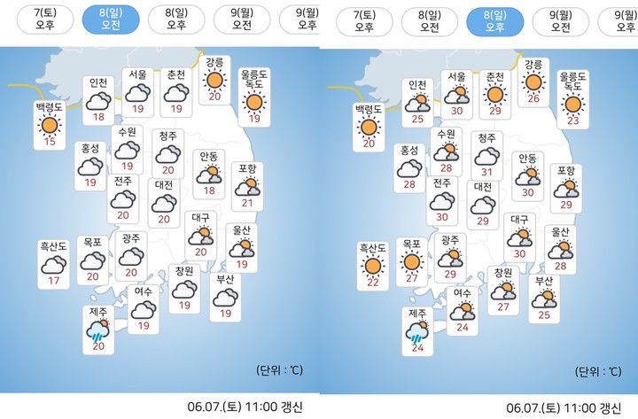 일요일인 오는 8일에는 전국이 대체로 흐리다가 오후부터 구름이 많아질 전망이다. 아침 최저기온은 17~21도, 낮 최고기온은 24~32도로 토요일에 이어 무더위가 이어지겠다. 서울은 19~30도, 대전과 대구 31도, 광주 30도, 부산 25도, 제주 20~24도로 예보됐다.
