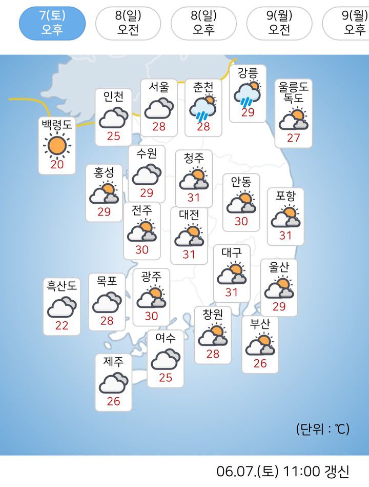 7일 오후, 전국 대부분 지역에 30도 안팎의 초여름 더위가 이어진다. 기상청에 따르면 이날 아침 최저기온은 13~23도, 낮 최고기온은 24~33도로 예보됐다. 서울은 28도, 대전과 대구는 31도, 광주 30도, 부산 26도, 인천 24도로 예상된다.