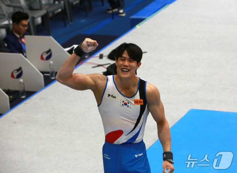 허웅이 2025 기계체조 아시아선수권대회 안마 결승에서 연기를 펼친 뒤, 화이팅을 외치고 있다.2025.6.7./뉴스1 ⓒ News1 손도언 기자 |