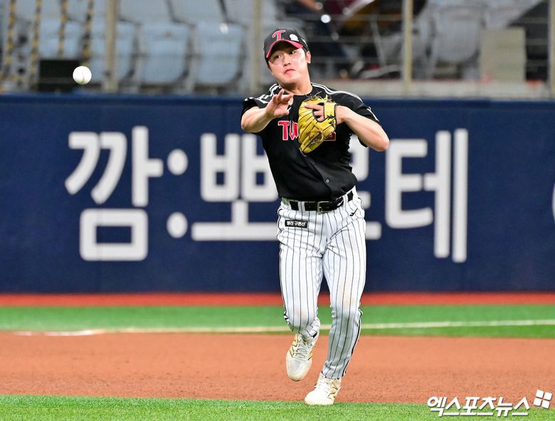 (엑스포츠뉴스 고척, 김한준 기자) 7일 오후 서울 구로구 고척스카이돔에서 열린 '2025 신한 SOL Bank KBO리그' LG 트윈스와 키움 히어로즈의 경기, 4회말 1사 LG 손용준이 키움 임지열의 타구를 잡아 1루로 송구하고 있다.