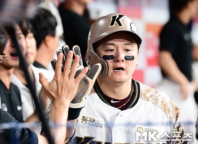 8회말 2사 1, 2루에서 키움 임지열의 우전안타때 2루주자 최주환이 득점을 올린 후 더그아웃 동료들과 하이파이브를 나누고 있다.