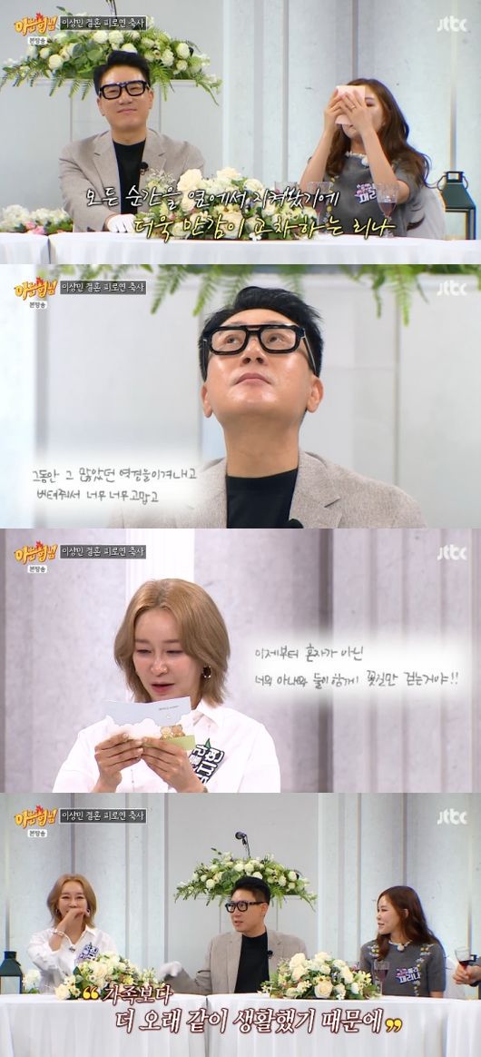 채리나, 김지현 등은 피로연 축사를 읽으며 눈물을 참지 못했다. 오랜 기간 고생한 이상민에게 행복의 길만 있기를 바라며 진심을 전했다. 이를 듣던 이상민은 억지로 눈물을 참으려 “너무 감사하고 고맙다”라고 고마운 마음을 전했다.