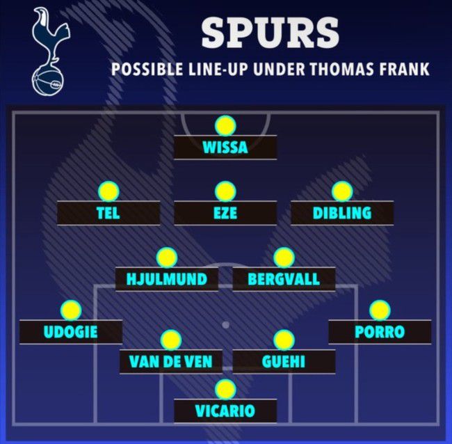 영국 '더 선'은 7일(이하 한국시간) 프랭크 감독 부임 시 가능한 라인업을 내놓았다. 엔제 포스테코글루 감독이 유럽축구연맹(UEFA) 유로파리그(UEL) 우승에도 경질이 된 가운데 유력 후보로 프랭크 감독이 이야기되고 있다. 프랭크 감독은 브렌트포르를 74년 만에 프리미어리그로 올려놓았고 연속 잔류와 함께 경쟁력을 드러내면서 높은 평가를 받았다.