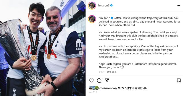 손흥민은 자신의 SNS를 통해 “감독님, 당신은 이 클럽의 궤도를 완전히 바꿨습니다. 당신은 처음부터 끝까지 스스로, 그리고 우리를 믿어줬고 단 한 순간도 흔들리지 않았습니다. 다른 사람들이 의심할 때조차 말이죠”라며 “당신은 처음부터 우리가 무엇을 해낼 수 있는지 알고 있었습니다. 당신만의 방식대로 해냈고 그 방식은 이 클럽에 수십년 만에 가장 위대한 밤을 선물했습니다. 우리는 그날의 기억을 평생 간직할 것입니다”라고 이야기했다.