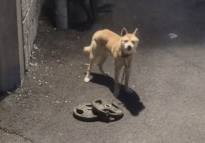 [서울=뉴시스]장가린 인턴 기자 = 30kg짜리 바벨에 묶인 채 산속에 유기된 강아지가 구조됐다.