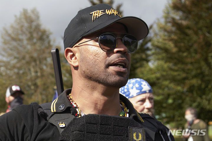 [포틀랜드=AP/뉴시스] 2020년 9월26일(현지 시간) 미 오리건주 포틀랜드 델타파크에서 군중을 향해 연설하고 있는 엔리케 타리오 프라우드 보이스 당시 회장. 1.6의회 폭동 선동 혐의로 기소됐다 도널드 트럼프 대통령에게 사면 받은 타리오 등 회원 5명은 6일 정부를 상대로 1억 달러가 넘는 국가배상을 청구했다. 2025.06.08. |