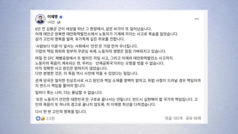 대선 하루 전날 발생한 고 김충현 씨 사망 사고에, 이재명 대통령은 SNS를 통해 "일하다 죽는 나라는 용납할 수 없다"는 글을 남겼습니다.