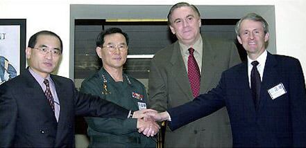 2003년 10월 6일 미군의 용산기지 반환규모와 이전비용등을 논의하기 위해 서울 미군 용산기지에서 열린 '미래 한미동맹 정책구상 5차 회의'에서 양측 대표들이 회의에 앞서 악수를 나누고 있다. 왼쪽부터 위성락 외교부 북미국장, 차영구 국방부 정책실장, 리처드 롤리스 미 국방부 동아태 담당 부차관보 |
