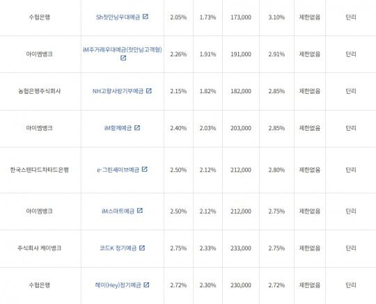 8일 금융감독원 금융상품통합비교공시에 따르면 은행 12개월 정기예금 가운데 최고 우대금리를 제공하는 상품은 수협은행의 ‘Sh첫만남우대예금’로 나타났다. 이 상품은 최고 3.10%의 금리를 제공한다. 기본 세전이자율은 2.05%이며 ▲첫거래 우대 1.0%p ▲마케팅 전체 동의 0.05%p ▲스마트폰뱅킹의 상품알리기 사용 0.80%p(만기시) 등이 추가돼 최고 1.05%p의 우대금리를 받을 수 있다. 1인 1계좌로 개설할 수 있으며 가입금액은 100만원 이상이다.