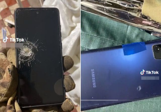해당 영상에서 엄폐물에 몸을 숨긴 우크라이나 군인은 “675달러짜리 휴대전화와 군 인식표가 목숨을 구했다”면서 주머니에서 스마트폰을 꺼내 보이고 있다. 스마트폰에는 찢긴 듯한 군 인식표와 보호 케이스 모습이 확인된다. 특히 케이스 한가운데에 총탄이 기기를 뚫고 박혀있는 것이 눈에 띈다.