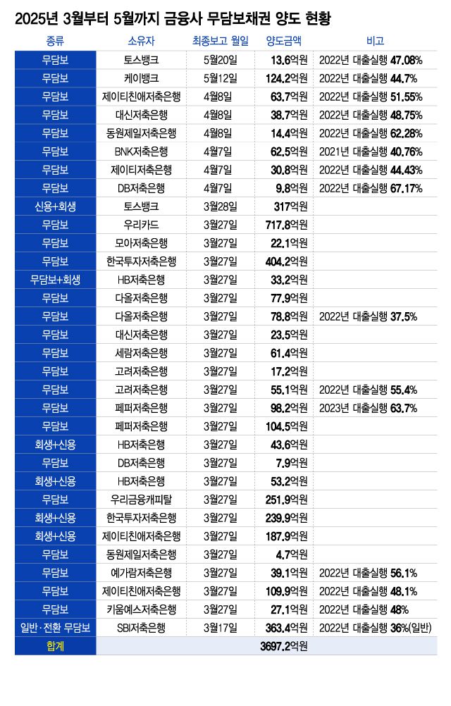 8일 머니투데이가 집계한 최근 3개월(3월 1일~5월 31일) 금융사들의 자산유동화 양도등록 현황에 따르면 무담보 NPL은 총 3697억2000만원어치(33건) 양도거래됐다. 채권은 총 4만5210개, 차주수는 3만8378명이다. 차주 1명당 채무 1.2개를 갖고 있다.