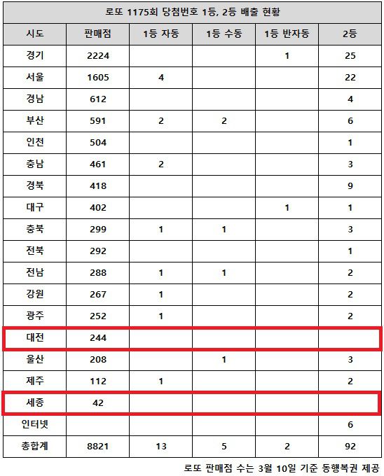 동행복권이 7일 추첨한 로또 1175회 당첨번호 조회 결과 1등은 20명, 2등은 92게임이다. 전국 17개 시도 중 대전 세종 지역에서는 로또 고액(1,2등) 당첨 판매점이 단 한 곳도 나오지 않았다.