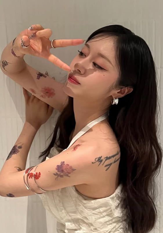 팔과 어깨 전체적으로 수채화처럼 번진 타투가 눈길을 사로잡는다. 꽃을 표현한 타투는 지연의 세련된 이미지와 어우러져 감각적인 분위기를 자아낸다. 흐린 초점으로 블러 처리된 듯한 느낌을 주며 몽환적인 매력을 더했다.