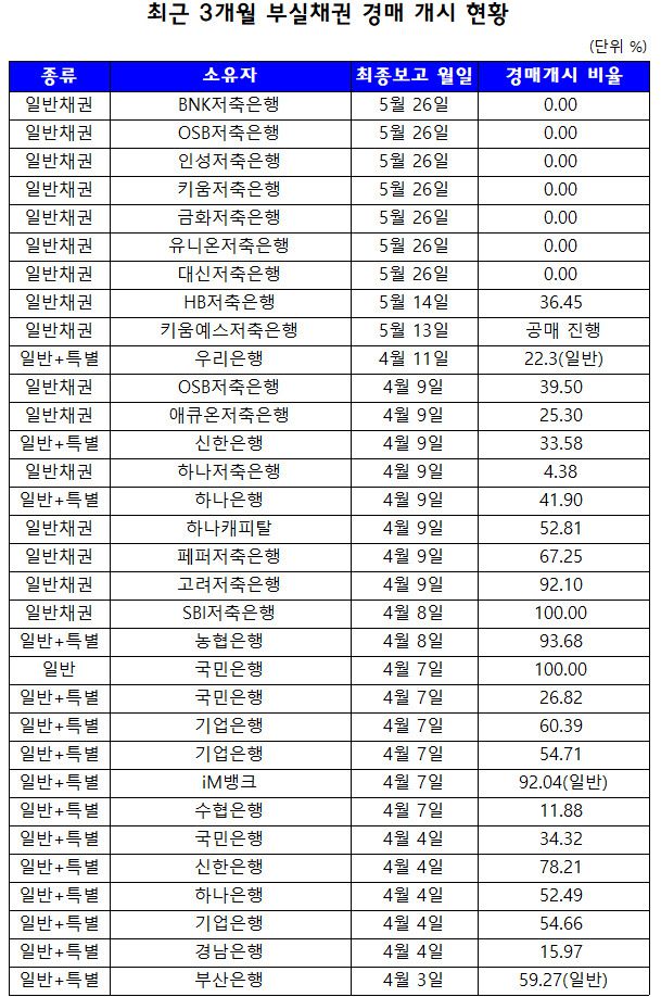 올해 3월부터 5월까지 은행과 저축은행 등 1·2금융권의 부실채권의 담보물이 경매에 넘어간 경우는 절반이 되지 않았다. BNK·OSB·인성·키움·금화·유니온·대신저축은행 등 2금융권의 부실채권 양도등록이 몰린 지난달 26일에도 경매 개시된 건은 없었다.