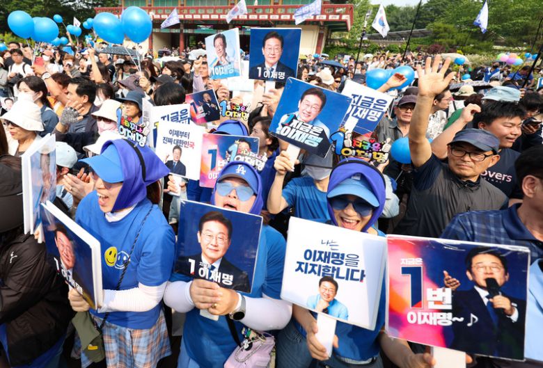 | 지난달 28일 서울 광진구 어린이대공원 정문 앞에서 열린 이재명 대통령 집중유세에서 환호하는 지지자들 / 사진=연합뉴스 |