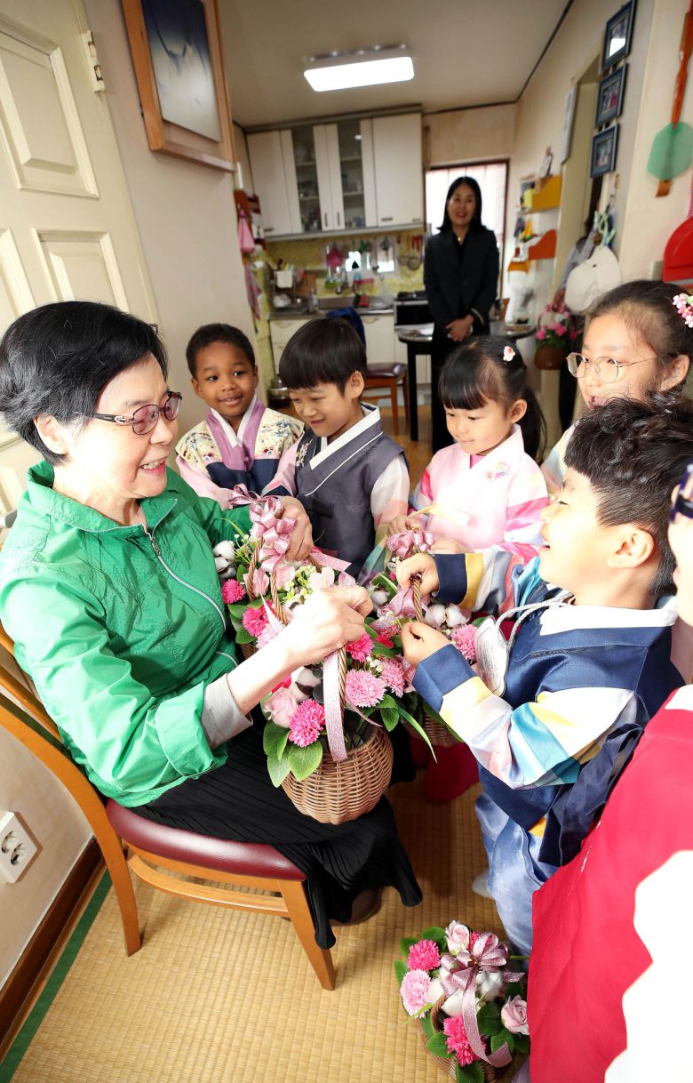 어버이날을 하루 앞둔 지난 5월 7일 광주 북구 중흥동 행정복지센터 직원과 중흥하나어린이집 아이들이 지역 돌봄어르신 세대를 방문해 카네이션을 전달하고 있다. [연합] |