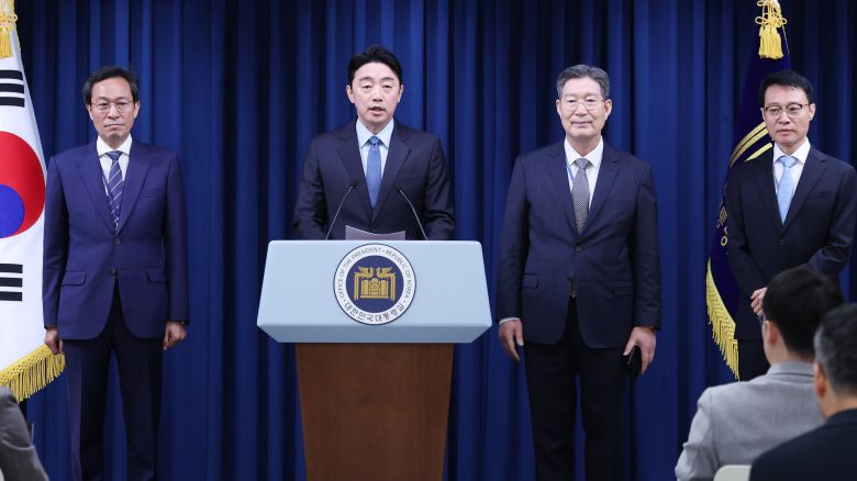 강훈식 대통령 비서실장이 8일 서울 용산구 대통령실 청사에서 수석급 인선 발표를 하고 있다. 우상호 정무수석, 강훈식 대통령 비서실장, 오광수 민정수석, 이규연 홍보수석(왼쪽부터)./뉴스1