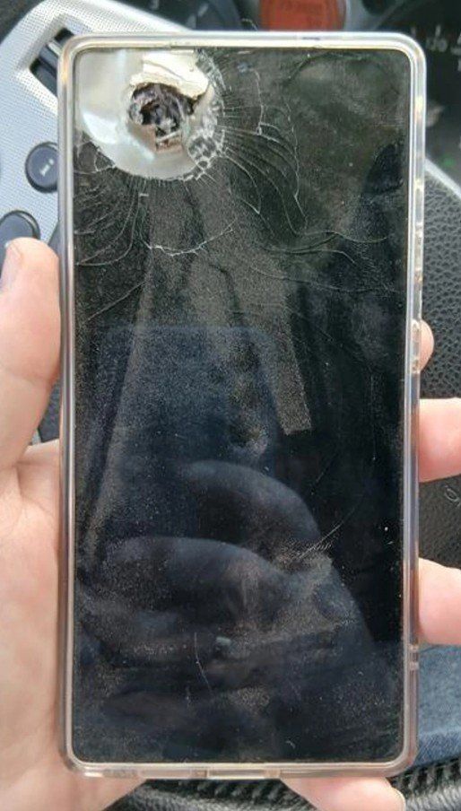 그는 파편이 박힌 스마트폰의 사진을 함께 올렸다. 사진을 보면 휴대전화 왼쪽 상단이 심각하게 훼손된 모습이다.
