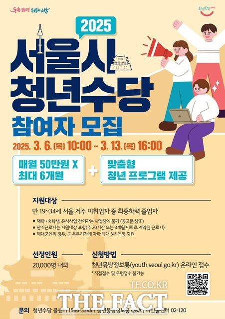 [더팩트ㅣ설상미 기자] 서울시는 진로 탐색과 취업 준비에 집중할 수 있도록 청년들의 생계 부담을 덜어주는 ‘서울 청년수당’ 참여자를 추가 모집한다.