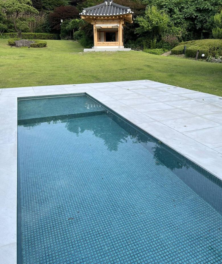 이재명 대통령은 7일 저녁 더불어민주당 대표 시절 1·2기 당 지도부 인사들을 대통령 관저로 불러 만찬을 했다. 1기 원내대표였던 박홍근 민주당 의원은 만찬이 끝난 뒤 페이스북에 관저 야외에서 이 대통령과 찍은 사진을 여럿 올렸다. 이 가운데 풀밭 사이에 설치된 수영장으로 보이는 사진도 있었다. 파란색 타일로 마감된 직사각형 시설물은 단차를 두어 점차 깊어지는 구조로 물이 채워져 있었다. 가장 깊은 곳은 성인 무릎 높이 정도였다. 수조 주변은 대리석 재질로 마감됐다.