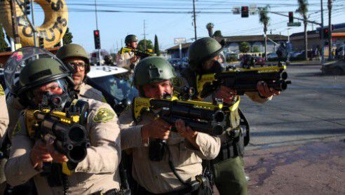 미국 로스앤젤레스에서 비합법 이민자 단속에 나선 이민세관단속국 요원 등이 주민들의 반대 시위에 직면하자, 시위대에게 가스총을 겨누고 있다. 로이터 연합뉴스