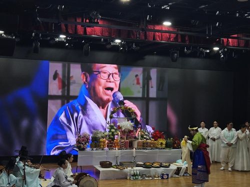 8일 서울 구로구 송해아트홀에서 열린 '고(故)송해 추모 3주년 탈상제'에서 지노귀굿을 진행하던 박수무당은 이렇게 말하며 참석자들의 손을 가만히 마주 잡았다.
