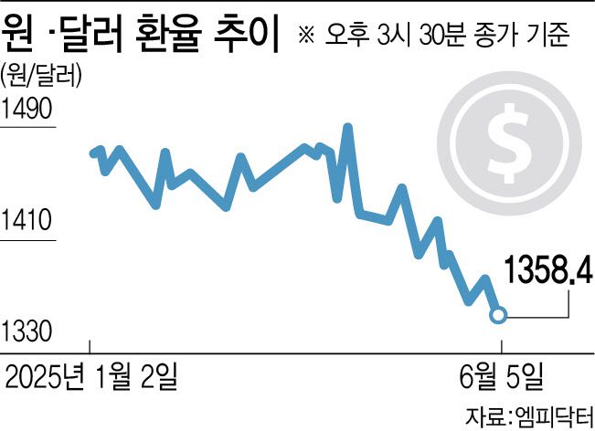 지난 5일 정규장에서 환율은 1358.4원으로 마감하며, 지난해 10월 14일(1355.9원) 이후 약 7개월 만에 최저치를 기록했다. 이재명 대통령 취임 이후 20조원 규모의 2차 추가경정예산 논의가 본격화하면서 외국인들이 지난 4~5일 이틀간 2조원 가량의 주식을 사들였다. 이는 커스터디(수탁) 매도로 이어져 환율 하락을 주도했다.