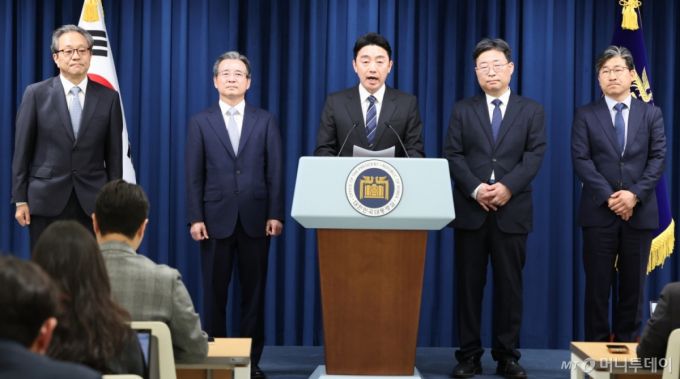 강훈식 대통령 비서실장이 6일 서울 용산구 대통령실 청사에서 대통령실 조직개편안 및 1차 인선 발표을 하고 있다.    왼쪽부터 문진영 사회수석, 김용범 정책실장, 강 비서실장, 하준경 경제성장수석, 류덕현 수석급 재정기획보좌관. 2025.6.6/뉴스1  Copyright (C) 뉴스1. All rights reserved. 무단 전재 및 재배포,  AI학습 이용 금지.
