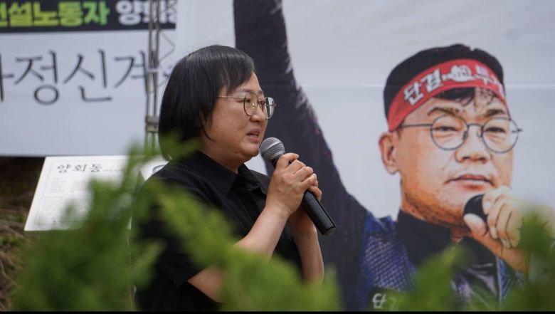 윤석열 정부의 ‘건폭몰이’ 수사에 항의하며 분신해 숨진 건설노동자 고 양회동 민주노총 건설노조 강원건설지부 3지대장의 배우자 김선희씨가 지난달 2일 경기 남양주시 마석 모란공원에서 열린 ‘양회동 열사 2주기 추모제’에서 발언하고 있다. 김선희씨 제공 |