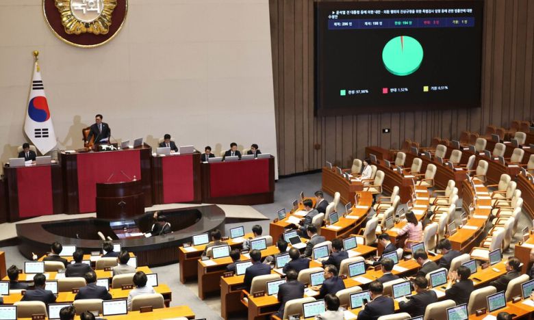 지난 5일 오후 열린 국회 본회의에서 ‘윤석열 전 대통령 등에 의한 내란·외환 행위의 진상규명을 위한 특별검사 임명 등에 관한 법률안’(내란 특검법) 수정안이 통과되고 있다. 윤운식 선임기자 yws@hani.co.kr |