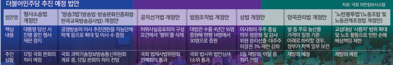 여당은 이 밖에도 공영방송 지배구조를 바꾸는 방송 3법을 조속히 처리할 방침을 세운 데 이어 지난 정부의 거부권에 막혔던 양곡관리법 개정안과 이른바 ‘노란봉투법’(노동관계법 개정안) 처리 시점도 저울질하고 있다. 당 핵심 관계자는 통화에서 “차기 지도부의 부담을 덜어주기 위해서라도 이번에 일부 쟁점법안을 처리하자는 논의가 있었다”며 “방송 3법과 형소법은 12일 본회의에서 처리할 가능성이 있다”고 말했다.