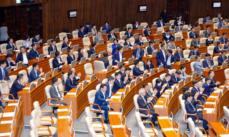 지난 5일 서울 여의도 국회 본회의장에서 국민의힘 의원들이 퇴장한 가운데 내란·채해병·김건희 특검법과 검사징계법 개정안을 통과시킨 더불어민주당 의원들이 손뼉을 치고 있다. 세계일보 자료사진 |