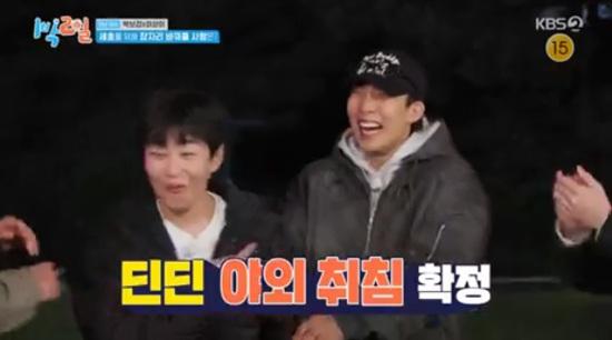 8일 방송된 KBS 2TV '1박 2일 시즌4'에서는 딘딘이 이상이의 선택으로 인해 야외취침을 하게 되는 모습이 전파를 탔다.