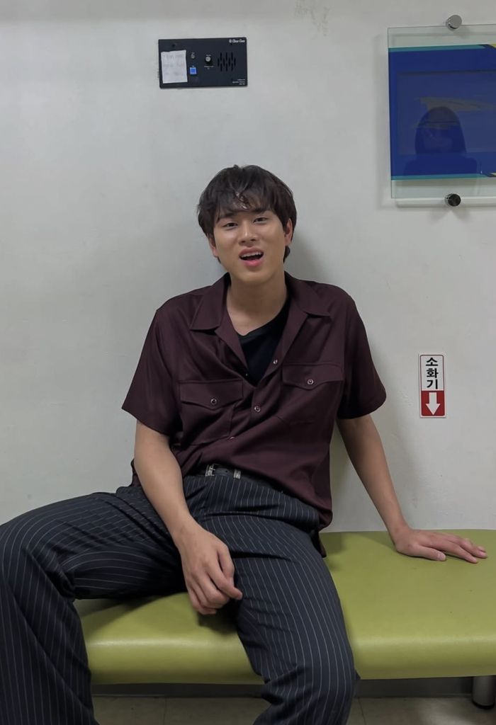 사진 속 이무진은 버건디 색상의 반팔 셔츠에 핀스트라이프 팬츠로 멋을 내고 있다.