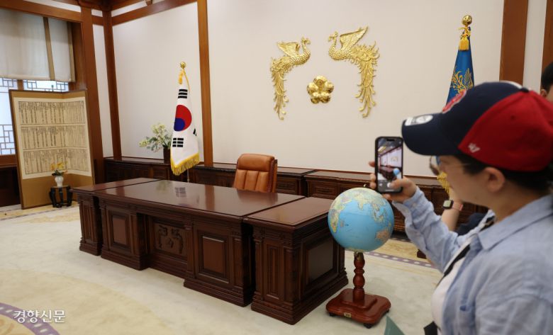 청와대 대통령 집무실, 볼 수 있을 때 찍어두자 휴일인 8일 서울 종로구 청와대를 찾은 시민들이 대통령 집무실을 구경하고 있다. 대통령실이 청와대로 복귀하면 2022년 5월부터 이어져 온 청와대 관람이 중단될 것으로 보인다. 권도현 기자 lightroad@kyunghyang.com