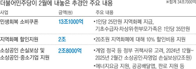 이 대통령의 대선 공약인 소상공인 빚 탕감 정책도 이번 추경에 포함될 것으로 보인다. 민주당의 지난 2월 추경안에는 소상공인·중소기업 지원금액 2조8000억원이 포함됐다. 민주당은 12·3 계엄 정국과 무안공항 폐쇄 등 정부 귀책사유를 고려해 지난해 12월부터 지난 2월까지 소상공인·자영업자의 손실을 보상해주자고 제안했다.