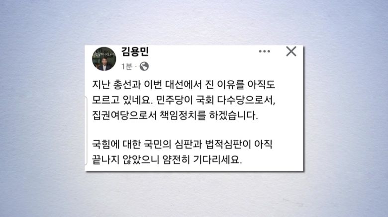 이어 국민의힘은 국민의 심판과 법적 심판이 아직 끝나지 않았으니 얌전히 기다리라고 지적했습니다.