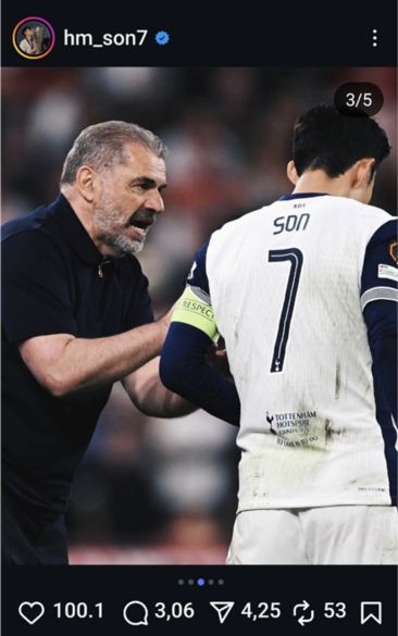 손흥민은 경질된 포스테코글루 감독에게 인스타그램을 통해 작별 인사를 했다. 감독을 먼저 “두목(gaffer)”이라고 부른 손흥민은 “당신은 내게 주장직을 맡김으로써 나를 믿어줬다. 내 선수 커리어의 최고 영광이었다. 가까이에서 당신 리더십을 배운 건 놀라운 특권이었다. 당신 덕분에 나는 더 좋은 선수, 더 나은 인간이 됐다. 친구, 당신은 토트넘의 영원한 전설이다”라고 적었다. [손흥민 인스타그램 캡처] |