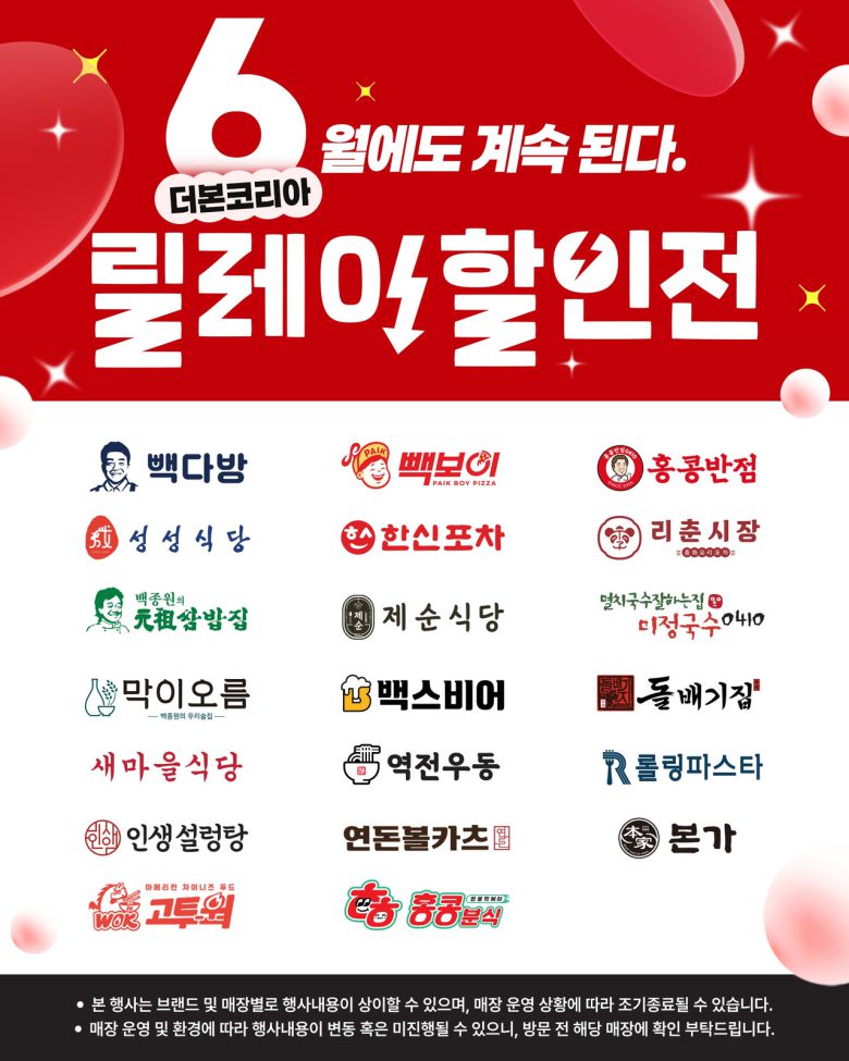 '더본코리아 6월 릴레이 할인전'은 6월 한 달 동안 브랜드별로 지정된 요일에 맞춰 대표 메뉴를 최대 50% 할인하거나 특별 기획 이벤트 형태로 진행된다. 요일별 할인 브랜드로는 돌배기집, 고투웍, 성성식당, 제순식당, 한신포차, 새마을식당, 본가, 역전우동, 미정국수, 원조쌈밥집, 롤링파스타, 연돈볼카츠 등이 참여한다.