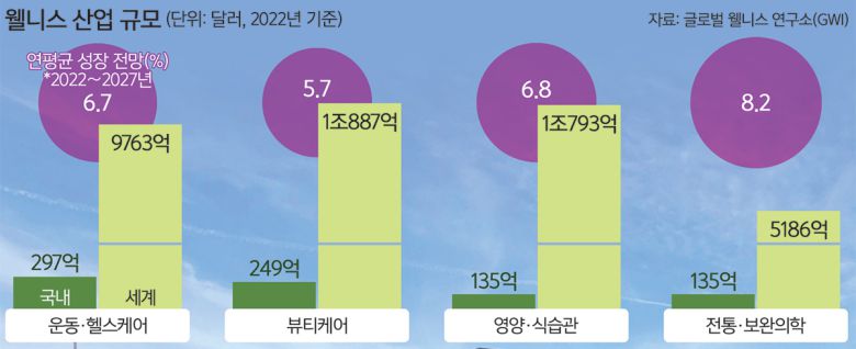 8일 한국무역협회의 ‘글로벌 웰니스 산업 성장과 우리나라 수출 유망분야 분석’ 보고서를 보면 글로벌 웰니스 연구소(GWI)는 2022년 글로벌 웰니스 산업 시장 규모가 세계 GDP의 5.6%에 달하는 5조6000억달러라고 추정했다. 2027년까지 연평균 8.6% 성장할 것으로 전망된다.