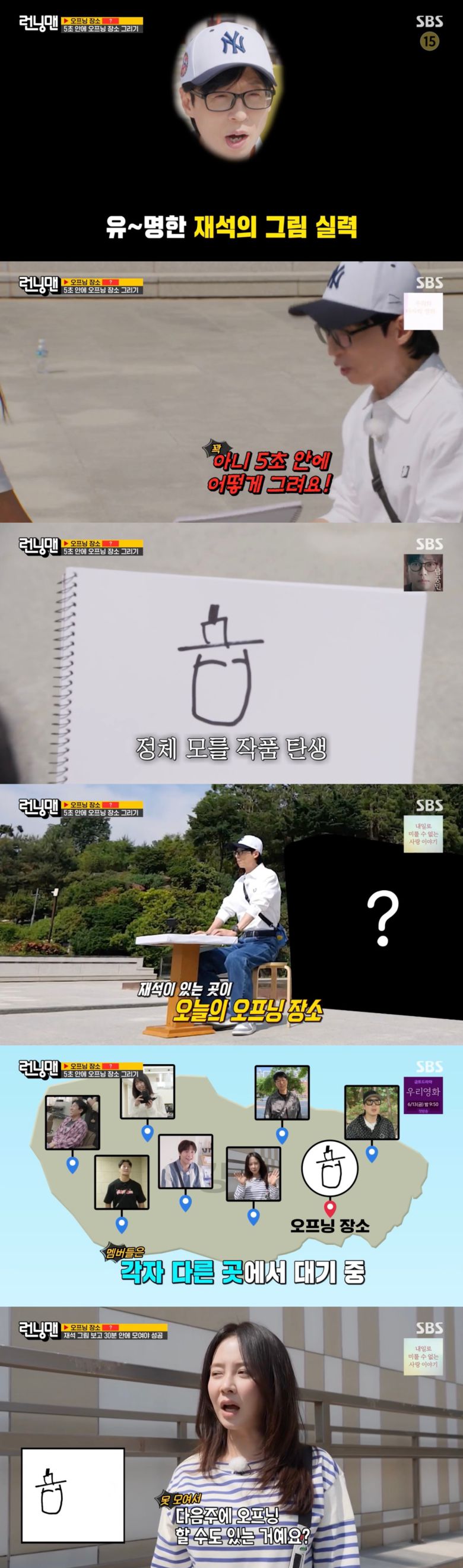 이날 방송에서 유재석은 혼자 오프닝 장소에 도착했다. 이에 제작진은 5초 안에 이곳이 그림을 그리라고 했다.
