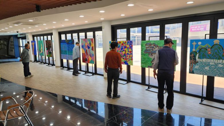 8일 부산 금정구 스포원파크 경륜장을 찾은 시민들이 로비 라운지에 전시된 그림을 감상하고 있다. 부산시설공단은 이달 29일까지 스포원파크에서 발달장애 작가 4인과 비장애 작가가 협업해 마련한 그림 전시 ‘2025 발달장애 작가전시회 시리즈―길만 있으면’을 연다고 밝혔다.