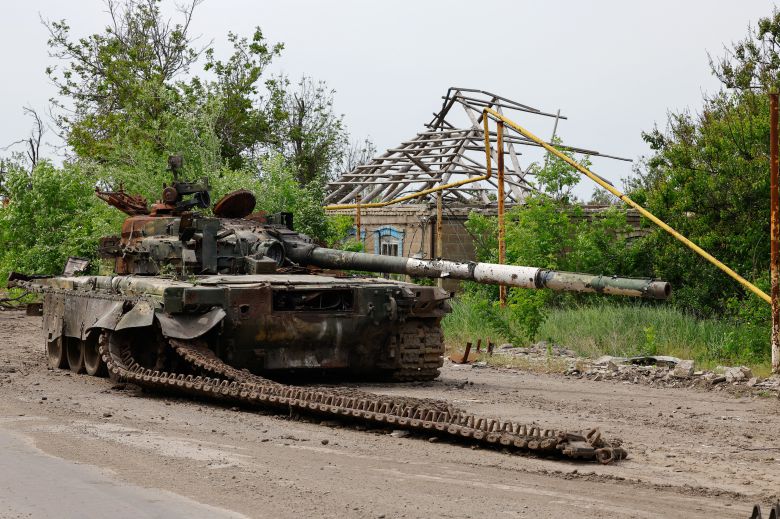 우크라이나 도네츠크주 우글레다르 근처에 버려진 러시아군 탱크의 잔해. 러시아군은 8일 자국 군이 도네츠크주를 넘어 우크라이나 중부로 진출했다고 주장했다. /로이터 연합뉴스 |