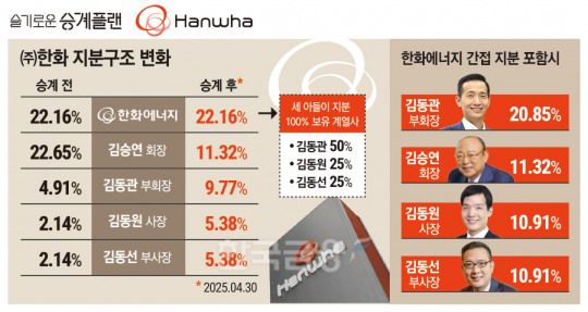 이에 따라 삼형제가 보유한 ㈜한화 지분율은 각각 9.77%, 5.38%, 5.38%로 상승했다. 김승연 회장은 11.32%로 줄었다.
