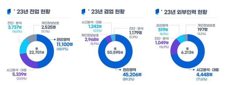 보안 업무를 겸하는 직원의 경우 사이버 보안 분야에 대한 전문성도 부족한 것으로 조사됐다. 보안 업무를 겸하는 인력의 경우 관리 영역이 가장 높은 비율로 89.1%로 나타났다. 개인정보 보호를 담당하는 겸업비율은 5.9%로 나타났다. 특히 기업 규모가 작을수록 보안 업무를 겸하는 경우가 많았다. 조사 결과, 겸업 직원 전체 2만 7785명 중 2만 2445명이 종업원 수 50~249명의 중소기업 재직자였다. 백분율로 환산하면 80.97%이다.