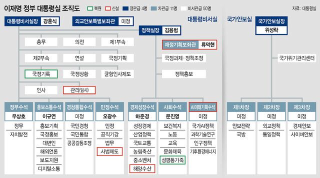 재정 전문가인 류덕현 중앙대 교수에게 기재부의 예산편성권을 견제할 재정기획보좌관(신설)을 맡겨 김용범 실장의 친정인 기재부에 과도한 힘이 들어가는 걸 막고, 진보적 사회복지학자인 문진영 서강대 교수를 사회수석에 임명해 경제·사회 정책이 지나치게 ‘우클릭’하지 않도록 균형을 맞추려고 한 고려도 엿보인다.