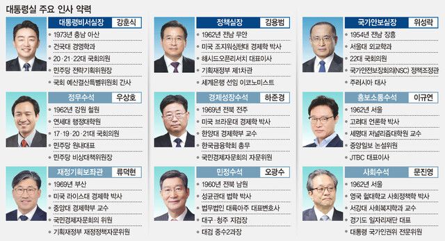 과거 윤석열 정부와 이명박 정부의 1기 인사에서 불거진 ‘서오남’(서울대 출신 50대 남성), ‘고소영’(고려대·소망교회·영남 출신) 논란과 달리 이날까지 공개된 대통령실 인사에선 뚜렷한 공통분모가 눈에 띄지 않는다. 정치인과 관료, 학자가 섞인데다 지역·출신 대학 등도 골고루 안배됐다.